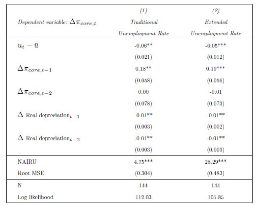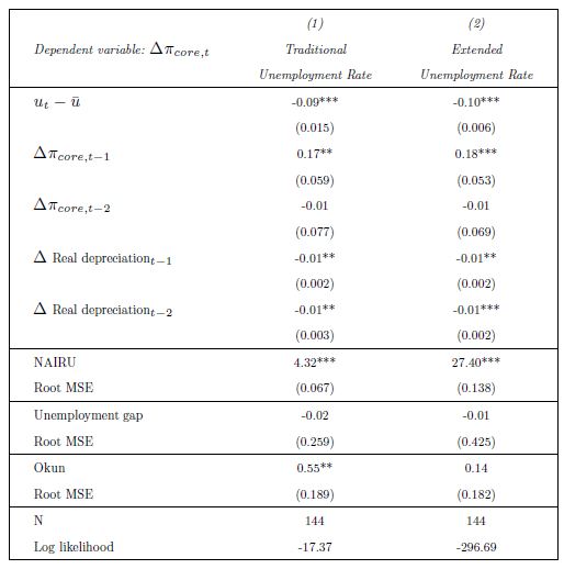 We expand the previous system of equations with the inclusion of an equation relating the unemployment gap to the output gap (Okun’s Law). The system of equations we use to estimate the NAIRU is the following: