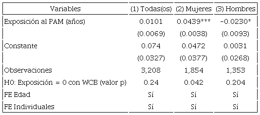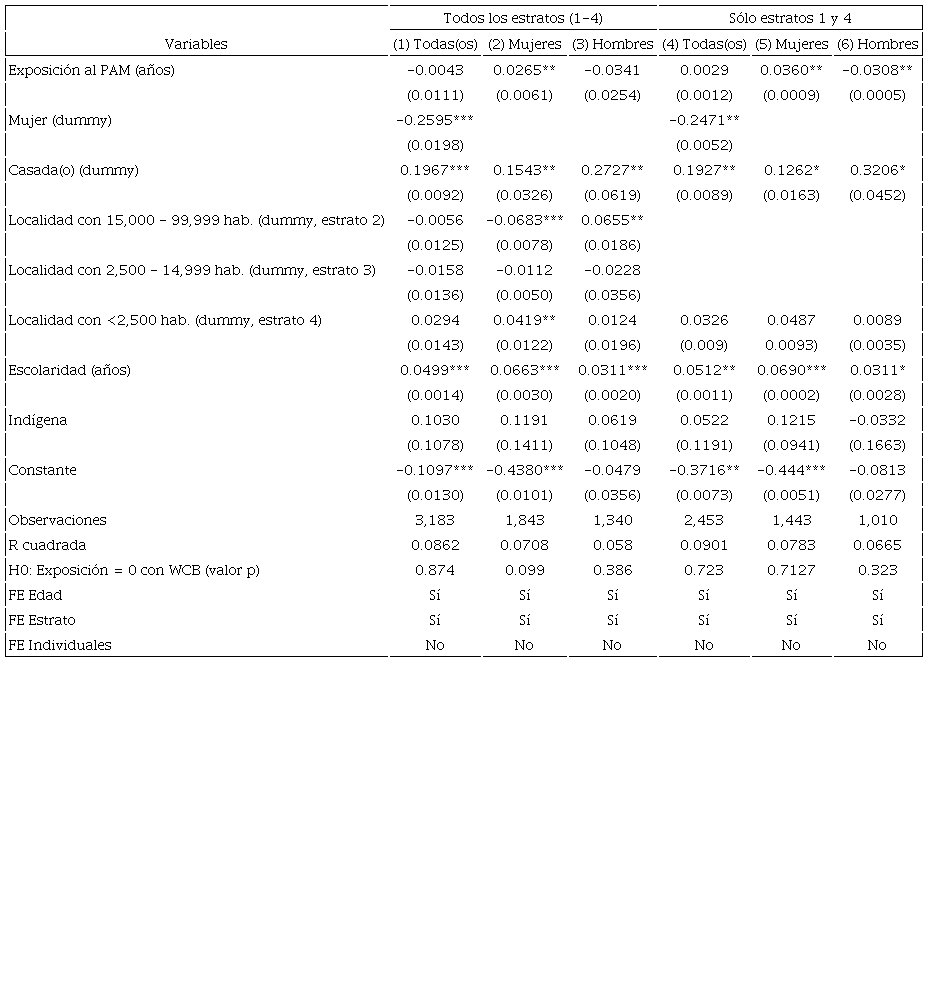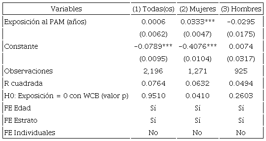 En este caso, en la ecuación (2’) la variable toma el mismo valor que la variable , los años de exposición al PAM en 2012, ya que en 2003 el programa aún no iniciaba. Sin embargo, al hacer la transformación, se eliminan todas las otras variables que son constantes para una misma persona a través del tiempo, y ya no es posible estimar su efecto. En particular, en el vector sólo queda la variable de estado civil, ya que las variables de condición indígena y género no varían en el tiempo; también se elimina el efecto fijo por tamaño de localidad , pues en nuestra muestra ninguna persona exhibe cambios en esta variable entre 2003 y 2012; finalmente, se elimina el efecto individual no observable , lo cual corrige cualquier sesgo que éste pueda generar sobre el coeficiente de la variable de tratamiento y que no se puede realizar en una estimación de corte transversal. Sin embargo, como se mostró anteriormente, hay sustento para confiar en nuestra estimación de corte transversal. Por ello, la estimación de la ecuación (2’) se realiza solamente como ejercicio de robustez, mientras que el resto del análisis se lleva a cabo usando el corte transversal de 2012.