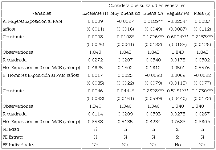 Respecto a la percepción subjetiva sobre el estado general de salud, el panel A del cuadro 10 muestra que, para una mujer mayor, los años de exposición al PAM tienen un efecto positivo y significativo sobre la probabilidad de que considere que tiene buena salud y un efecto negativo y significativo al 10% sobre la probabilidad de que considere que su salud es regular. En valor absoluto, la magnitud del estimado positivo (0.189, columna 3) es similar a la del negativo (-0.0254, columna 4). Los resultados del WCB al final de ese panel muestran que el primer estimado pierde significancia, mientras que el segundo se mantiene como significativo al 10%. Para las mujeres mayores, los impactos del PAM en la probabilidad de reportar una salud excelente (columna 1), muy buena (columna 2) o mala (columna 5) son todos cercanos a cero y no significativos estadísticamente. Estos resultados sugieren que el PAM ha tenido un impacto positivo en la percepción de salud de las mujeres mayores que se encuentran en el margen entre una salud buena y una regular, pero no para quienes están en los extremos, ya sea con una salud mala o una muy buena o excelente.