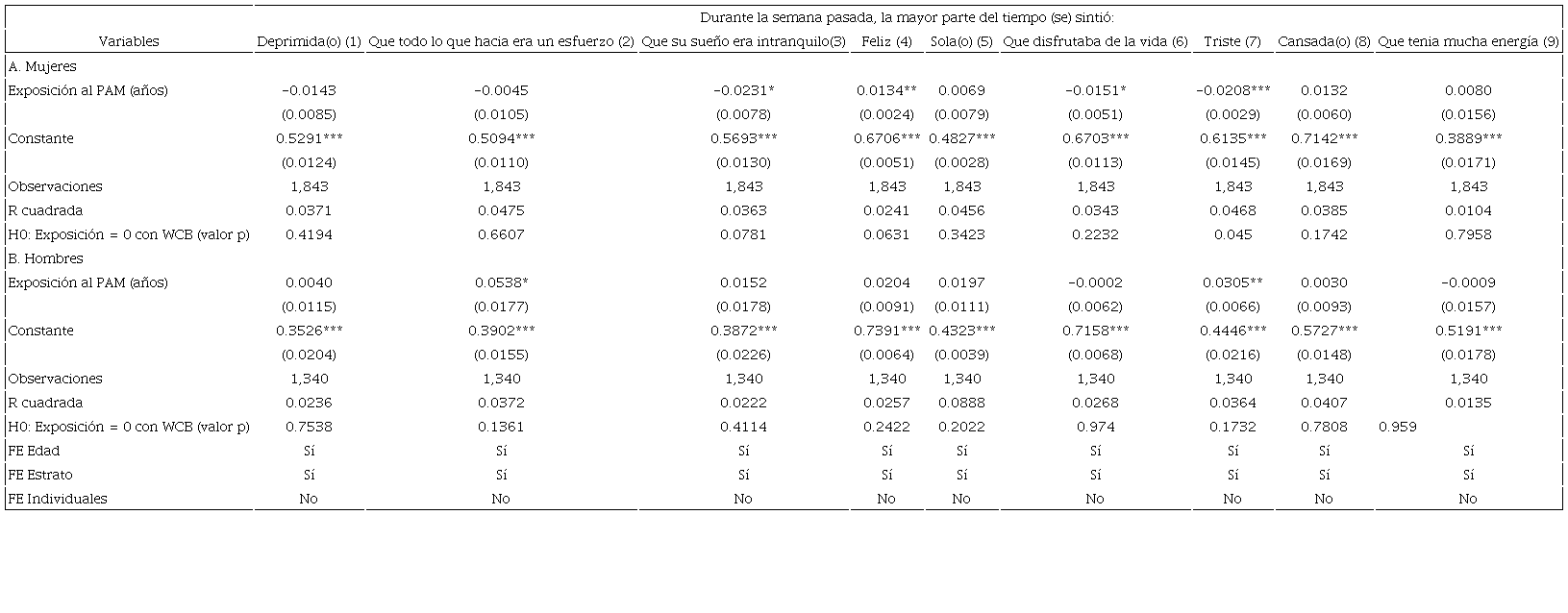 Como ejercicio adicional de robustez, el cuadro 9 presenta la estimación de primeras diferencias (ecuación 2’), la cual, como se comentó en la sección anterior, aprovecha la estructura de panel de los datos para corregir el sesgo que podría derivarse de determinantes individuales no observables del bienestar subjetivo, que sean constantes a través del tiempo. Los resultados en dicho cuadro son similares a los obtenidos en la estimación de corte transversal, presentados en las columnas 1 a 3 del cuadro 7. Los años de exposición al PAM no tienen impacto significativo sobre el bienestar subjetivo cuando se incluyen hombres y mujeres juntos en la muestra; el impacto para los hombres es negativo, de una magnitud similar al del cuadro 7 y, en este caso, significativo al 10%; para las mujeres, el impacto del PAM es positivo, un poco mayor al del cuadro 7 y significativo al 1%. En la parte inferior del cuadro 9, los resultados del WCB indican, una vez más, que los dos primeros estimados no son estadísticamente significativos, mientras que el correspondiente a las mujeres sigue siendo significativo al 5%.