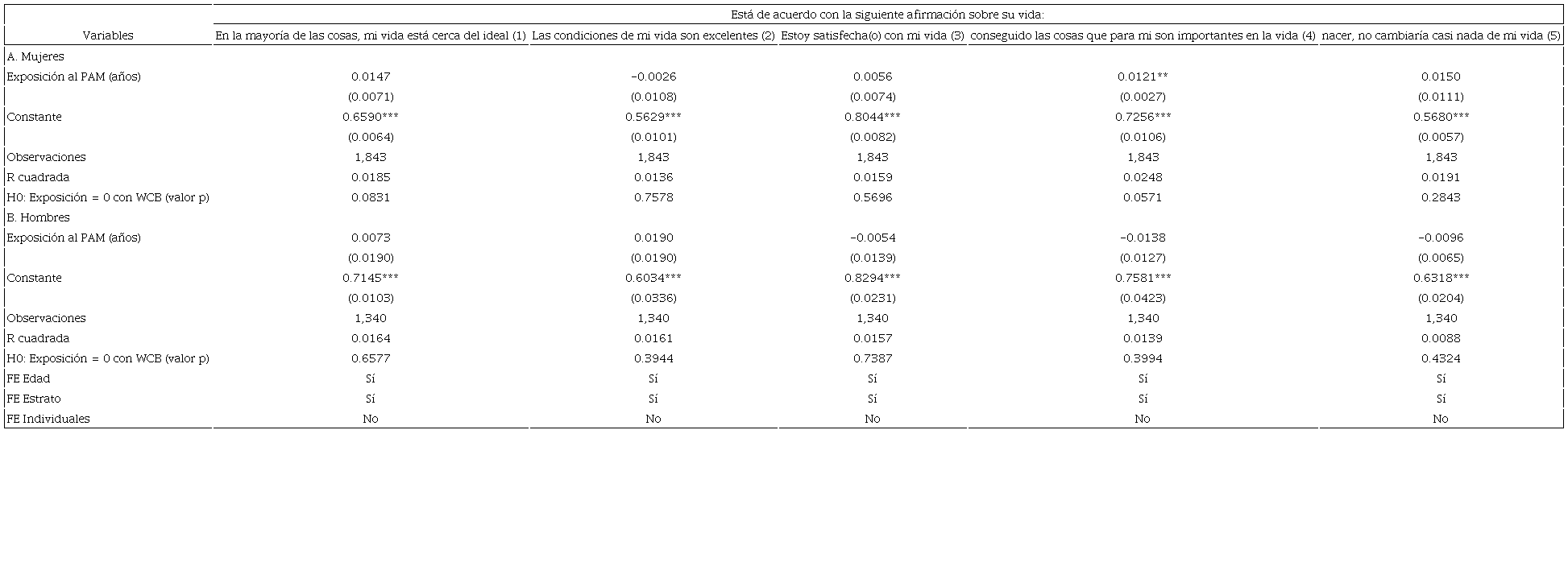 Una vez verificada la robustez de los resultados para el índice de bienestar subjetivo, estimamos regresiones similares a la ecuación (1) para cada uno de sus componentes para ver cuáles de ellos son los que el PAM impacta en mayor medida.