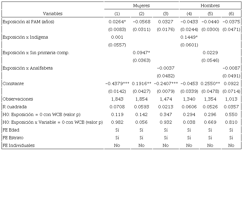 Para los hombres, la exposición al PAM no tiene efectos estadísticamente significativos sobre el bienestar subjetivo, como se muestra en las columnas 4 a 6, pero su interacción con la variable binaria de ser indígena tiene un efecto positivo, de magnitud relativamente grande y significativo al 10% (columna 1). La significancia de este coeficiente se mantiene con el procedimiento WCB, como se ve en la parte inferior del cuadro. Lo anterior indica que, para los hombres que no son hablantes de lengua indígena, la exposición al PAM tiene un impacto no significativo sobre el bienestar subjetivo, mientras que para aquellos que sí lo son, un año adicional de exposición al programa lo aumenta en 0.10 desviaciones estándar (-0.0433+0.1449). No encontramos otros impactos significativos para los hombres en términos de su educación ni alfabetismo en las columnas 5 y 6.