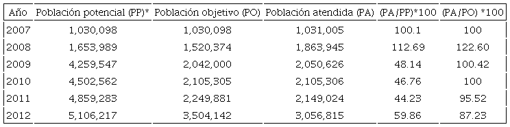 En el cuadro 1 se puede ver que, debido a la expansión del programa por tamaño de localidad, entre el 2007 y 2012 la población potencial se quintuplicó y la población objetivo se triplicó. En 2008, el programa atendía a 1 863 945 adultos mayores. Con la extensión de 2009, el padrón de beneficiarios contaba con 2 050 626 mayores de 70 años y, en 2010, el número de beneficiarios ascendía a 2 105 306. Para 2012 la población atendida6 se elevó a 3 056 815 adultos mayores, es decir, 87.23% de la población objetivo (CONEVAL, 2008-2012).