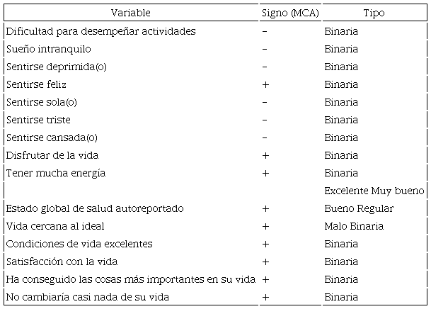 Las secciones utilizadas en esta investigación corresponden a los datos sociodemográficos y de salud. La sección de salud del ENASEM incluye un conjunto de preguntas de valoración personal sobre satisfacción con la vida, estado anímico durante la semana previa a la encuesta y estado de salud en general, información que se utiliza para construir un índice de bienestar subjetivo, la variable dependiente de interés, mediante el método de Análisis de Correspondencia Múltiple (MCA por sus siglas en inglés). Para la construcción del índice se seleccionaron quince variables; una con categorías ordenadas (estado global de salud auto-reportado) y catorce binarias referentes a satisfacción con la vida y estados anímicos (ver cuadro 2). Cabe mencionar que, dada la información captada en el ENASEM, nuestro índice de bienestar subjetivo tiene componentes relacionados con los enfoques de bienestar evaluativo (satisfacción con la vida) y hedónico (estados de ánimo), pero, por falta de datos, no con el enfoque de bienestar eudaimónico.