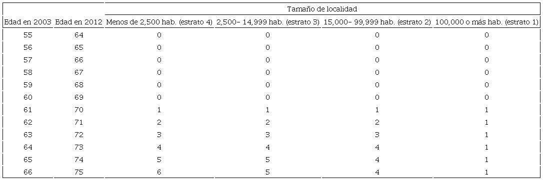 En 2012, todas las personas con 70 y más años eran elegibles para el programa, independientemente de la localidad en que residían en ese momento. Sin embargo, estas personas elegibles en dicho año pueden diferir en sus años acumulados de exposición al PAM, dependiendo de su edad y del tamaño de localidad en la que residen, justamente porque el programa se extendió gradualmente con base en tamaño de localidad. Adicionalmente, cabe notar que las personas menores de 70 años aún no eran elegibles para el PAM en ese año, independientemente de su lugar de residencia. Como se muestra en el cuadro 3, todas las personas entre 64 y 69 años en ese momento, como no habían llegado a la edad mínima de 70 años para ser elegibles para el PAM, tienen todos cero años de exposición al programa. En contraste, las personas entre 70 y 75 años en 2012 son todas elegibles para el PAM en ese año, pero difieren en los años acumulados de exposición al programa, dependiendo de su edad y del tamaño de localidad en el que residen. En este grupo, los años de exposición al programa varían entre 1 y 6 años.