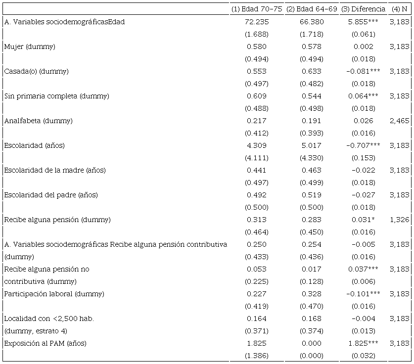 Respecto a la edad, la segunda dimensión que determina el tratamiento, para contar con grupos de tratamiento y de control que sean comparables, se restringió la muestra a personas cuya edad en 2012, después del PAM, se encontrara en una ventana alrededor de 70 años, la edad mínima para ser elegible para el programa. Específicamente, se incluyeron en la muestra solamente a las personas que tenían entre 55 y 66 años en 2003, quienes en 2012 tenían entre 64 y 75 años.