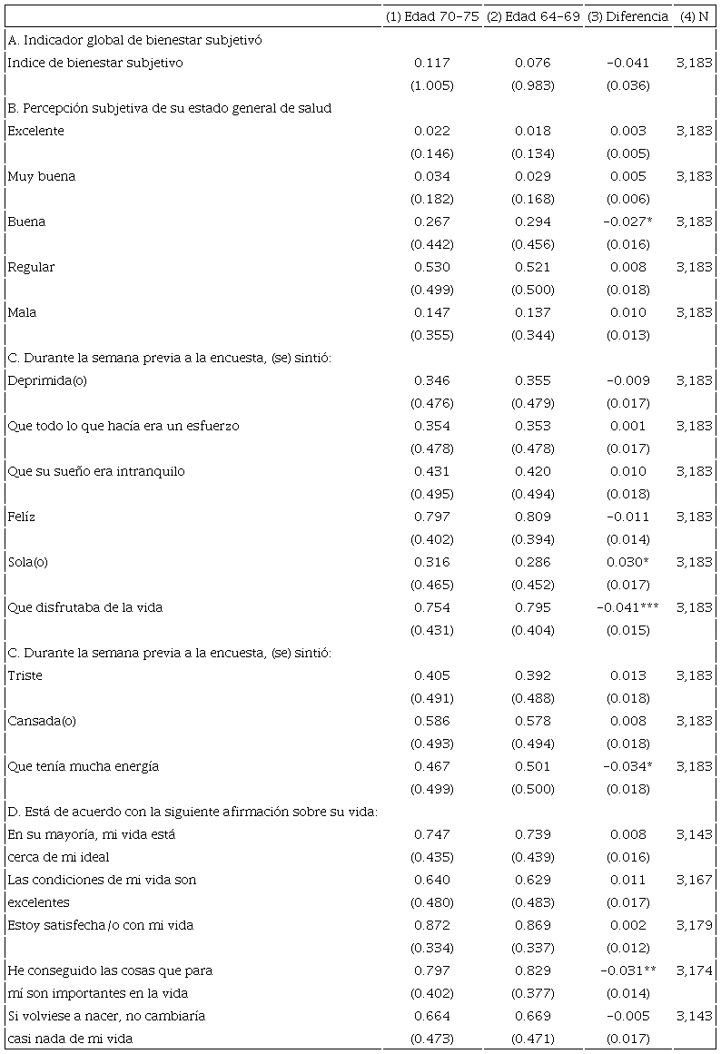 El cuadro 4b presenta las estadísticas descriptivas para el índice de bienestar subjetivo y cada uno de sus componentes. El panel A muestra que para el índice de bienestar subjetivo no hay diferencias significativas en media entre los dos grupos, lo cual puede deberse a que hay pocas diferencias que lo son para los componentes individuales del índice, como se describe a continuación. El panel B muestra que la mayoría de las personas de ambos grupos consideran que su salud es regular (52-53%) o buena (27-29%), y sólo en esta última parece haber una diferencia entre los grupos, significativa al 10%, en la cual el grupo de mayor edad tiene una menor proporción de personas que consideran que su salud es buena. En ambos grupos, una menor proporción se encuentra en los extremos, ya sea de muy buena o excelente salud, o de mala salud. En el panel C, se ve también que sólo en tres de las nueve variables de estado anímico preponderante durante la semana previa a la encuesta: el grupo de 70 a 75 años tiene una menor propensión a reportar que sintió que disfrutaba de la vida y que tenía mucha energía, y una mayor propensión a reportar que se sintió sola(o). En ambos grupos, aunque alrededor del 80% de las personas mayores reportó que se sintió principalmente feliz, alrededor de 35% reporta que se sintió deprimido, 42-43% reportó que su sueño era intranquilo y alrededor de 40% que se sintió triste. Finalmente, en el panel D se aprecia que la mayoría de las personas mayores de ambos grupos está de acuerdo con afirmaciones que expresan satisfacción con su propia vida (entre 63% y 87%, dependiendo de la pregunta) y que la única diferencia estadísticamente significativa entre los grupos es que el de mayor edad tiene una menor propensión a reportar que ha conseguido las cosas que considera importantes para su vida. En resumen, aunque hay contadas diferencias en los componentes del bienestar subjetivo, las que son significativas apuntan a un cierto deterioro de la salud general y del estado anímico con la edad.