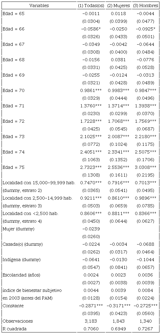 Para estudiar el efecto del PAM sobre el bienestar subjetivo de las personas mayores, se estiman regresiones por mínimos cuadrados ordinarios (MCO), usando los datos de corte transversal de la ronda de 2012. En estas regresiones se controla también por características sociodemográficas como años de escolaridad, variables indicadoras para ser mujer, para estar casada(o) y para hablar una lengua indígena, así como efectos fijos de tamaño de localidad y de edad. Se realizan estimaciones para todas las personas mayores juntas y también separadas por género.