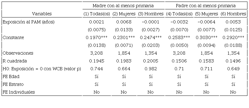 El cuadro 6 presenta los resultados de esta prueba de identificación. Se estimó la ecuación (1) usando una variable binaria igual a 1 si la madre del adulto mayor cuenta al menos con estudios de primaria y, en otra estimación separada, también con una variable igual a 1 si el padre cumple con esa condición. En todas las columnas del cuadro se ve que el coeficiente de la exposición al PAM es cercano a cero y no es estadísticamente significativo. Entonces, la educación de la madre y del padre no tienen correlación significativa con la exposición al programa en toda la muestra, y tampoco para mujeres y hombres por separado. Lo anterior es una confirmación más de la validez de nuestra estrategia empírica.