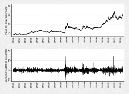 En relación con la economía de México, una variable importante que puede tener un comportamiento de acuerdo con percepciones y sentimientos de los agentes económicos es el tipo de cambio peso-dólar (MXN/USD). En este sentido, se pueden destacar algunos momentos relevantes en los años comprendidos de 2000 a 2018 (véase gráfica 1). A partir de la crisis de 2008 ha dejado de existir la estabilidad relativa que se venía observando desde el año 2000. La elección de Donald Trump como presidente de Estados Unidos, en noviembre de 2016, generó un incremento y una volatilidad considerable del tipo de cambio, similar a la experimentada en la crisis financiera de 2008-2009.