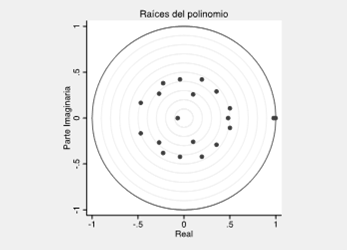 En la gráfica 10 se presenta una prueba de estabilidad que consiste en identificar si la relación entre las raíces inversas del polinomio autorregresivo con el que se modela el sistema está dentro del círculo unitario.