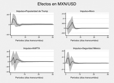 El modelo tiene como controles diferentes variables económicas fundamentales (por ejemplo, reservas en dólares y el balance del gasto público) y de contexto (el precio del petróleo, el comportamiento de la Bolsa Mexicana de Valores, etc.). Dentro de los principales resultados del trabajo se ha encontrado que existe un encarecimiento del dólar en pesos mexicanos, al menos en el corto plazo, el cual se relaciona con los tuits del mandatario. Adicionalmente, el modelo VAR se complementa con pruebas de Granger en relación con la causalidad de las variables que lo integran.