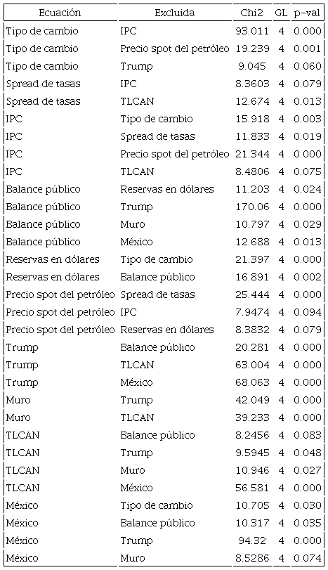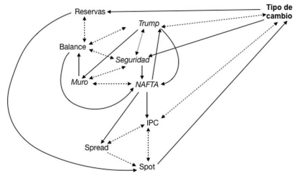 El tipo de cambio puede causar los tuits de seguridad relacionados con México. A su vez, los tuits relacionados con seguridad pueden causar tuits relacionados con el TLCAN y la construcción del muro, los cuales inciden en la popularidad de Trump, misma que causa a su vez el tipo de cambio. Se observa que los tuits sobre seguridad en México también pueden incidir en el balance del gobierno. El precio spot de los precios del petróleo se relaciona con varias variables. Puede causar al tipo de cambio y a su vez puede ser causada por el IPC, el spread y las reservas.
