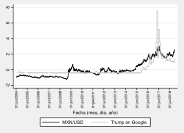 En la gráfica 2 se analiza la relación del tipo de cambio (serie en negro) y la popularidad de Donald Trump en Google Trends (serie en gris). La relación entre estas dos variables es muy relevante para el estudio. Antes de la designación de Trump como candidato a la presidencia (es decir, antes de 2015), las series son estables. A mediados de 2015, la popularidad de Trump muestra una tendencia positiva y alcanza un máximo justo en el momento en que la serie del tipo de cambio también alcanza su punto más alto. Este momento se relaciona exactamente con la elección de Trump.