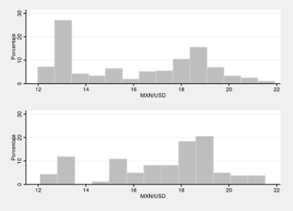 En la gráfica 3, se analiza con histogramas el comportamiento del tipo de cambio ante estos dos escenarios.