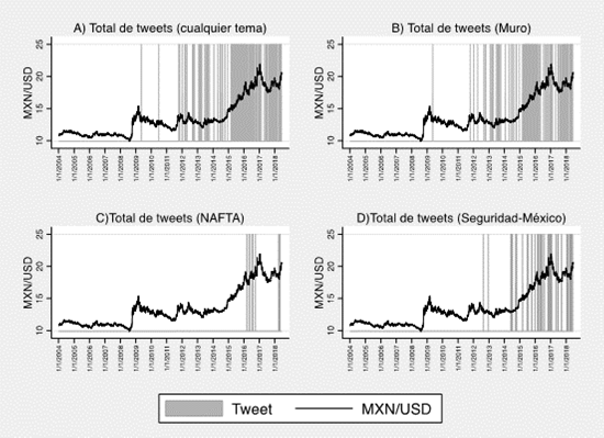 Dada la evidencia de que el peso mexicano podría depreciarse por anuncios sobre la probable renegociación del Tratado de Libre Comercio de América del Norte (TLCAN, o también llamado NAFTA por sus siglas en inglés) y la imposición de barreras comerciales a las exportaciones mexicanas (Clavellina, 2018; Islas-Camargo et al., 2018), se podría asumir que existe un vínculo entre los mensajes que Trump escribe en Twitter y el comportamiento del tipo de cambio peso/dólar.