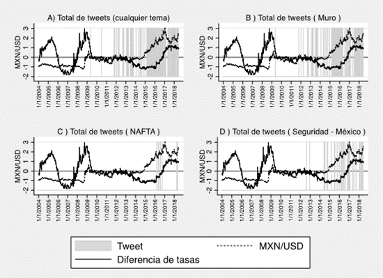 En esta sección se analiza la forma en que las variables económicas se relacionan con el tipo de cambio y la existencia de tuits emitidos por Trump. Para ello, se presenta el movimiento del tipo de cambio (línea punteada) y de la variable analizada (línea sólida). Se incluye una barra en gris para identificar el momento en que se emite un tuit de cualquier tema (sección A), la construcción del muro (sección B), la renegociación del TLCAN (sección C) y los temas de seguridad en México (sección D).