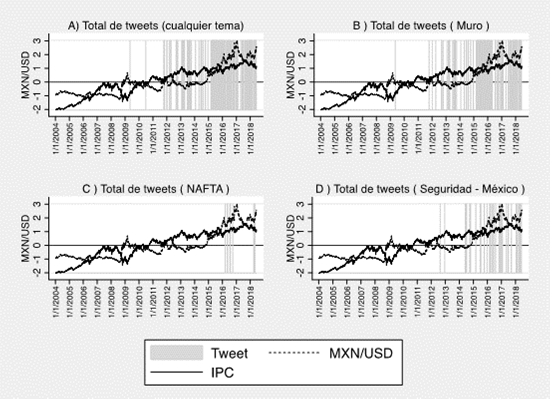 Se espera que ocurra este comportamiento debido a que un mayor volumen de transacciones en la BMV implica una mayor entrada de dólares y, por lo tanto, una reducción en el tipo de cambio. Para finales de 2008 y durante el 2009 se observa una caída importante en la BMV y un aumento significativo en el tipo de cambio. No se observa una situación similar para el caso del triunfo de Trump en 2016, donde el alza importante en el tipo de cambio coincide con los tuits en relación con el muro (sección B) y al TLCAN (sección C). En otros momentos de la serie, pese a que existen tuits, no se observan cambios en el patrón. Por lo cual se puede argumentar que quien invierte en la BMV lo hace de forma independiente a los tuis del mandatario estadounidense, salvo en 2016.
