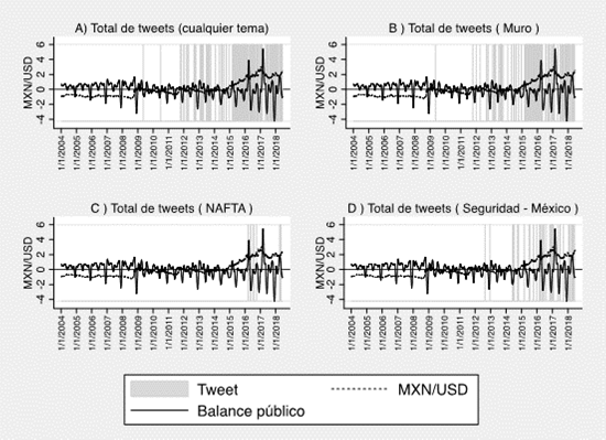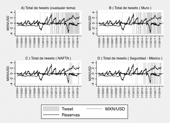 Un argumento consiste en que los tuis combinados en temas de seguridad, renegociación del TLCAN y construcción del muro, pudieron impulsar al alza el tipo de cambio peso/dólar; particularmente en el período de 2015 a 2017, el cual implica la definición de candidaturas, la campaña a la presidencia y el proceso de toma de posesión. En cuanto a las demás variables económicas, con claridad se observa un efecto de la actividad en Twitter en las reservas y en el balance del sector público. También se observa que la influencia puede no ser homogénea en las diferentes variables estudiadas.