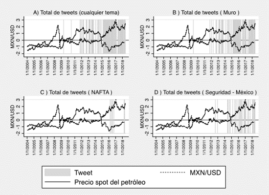 Se utiliza un análisis estadístico, gráfico y un modelo de vectores autorregresivos (VAR) para modelar el comportamiento del tipo de cambio peso/dólar en función de la popularidad de Trump y conceptos asociados con la relación entre México y Estados Unidos que aparecen en los tuits del mandatario, a partir de una selección de tres temas: 1) construcción del muro en la frontera con México; 2) renegociación del TLCAN y; 3) asuntos en materia de seguridad. Si bien el contexto de estos mensajes no es homogéneo, en su mayoría reflejan una opinión negativa en torno al país por parte del mandatario, por lo cual se sugiere que podrían afectar al peso mexicano.