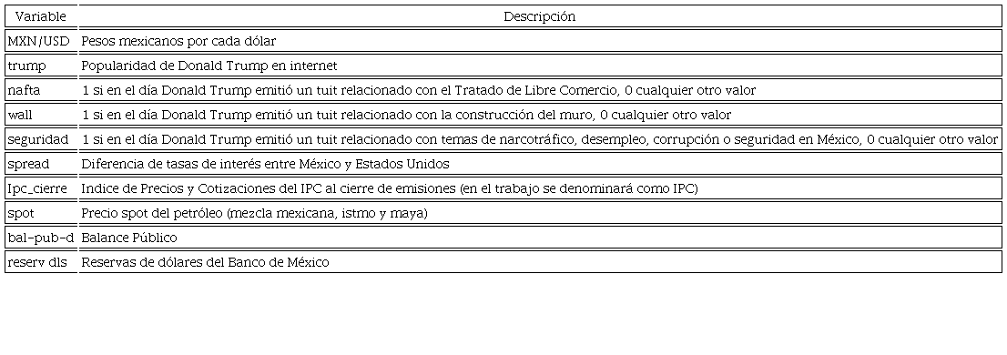 Se han seleccionado como variables no económicas las siguientes: 1) el Índice de Popularidad de Donald Trump construido a partir de búsquedas de Internet (Google Trends); 2) el número de tuits con relación al TLCAN; 3) el número de tuits con relación a la construcción del muro entre México y Estados Unidos; y 4) el número de tuits relacionados a temas de seguridad en México (incluye narcotráfico, desempleo y corrupción).