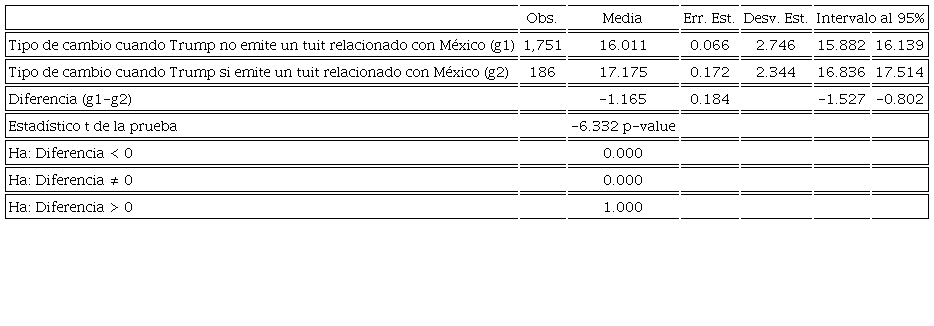 Se concluye que ambos grupos son diferentes, ya que el p-value (asociado a Ha: Diferencia ≠ 0) es igual a cero. La media del tipo de cambio es mayor cuando Trump emite un tuit en relación a México (el p-value de Ha: Diferencia < 0 también es cero).