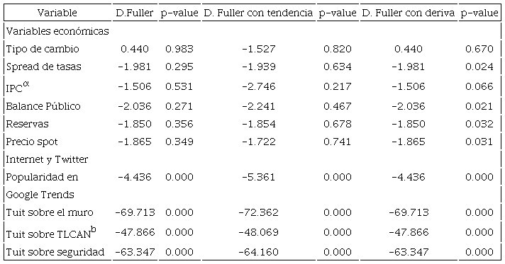 A fin de corregir posibles relaciones espurias entre las variables, se identifican aquellas que podrían ser no estacionarias. En el cuadro 3 se presentan los resultados de una prueba Dickey-Fuller que incluyen deriva y tendencia.