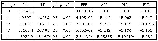 La regla que se sigue es elegir el modelo con el valor mínimo en diferentes criterios. Siguiendo a Lütkepohl (2005), se recomiendan BIC y HQ con los valores más bajos. De esta forma, el modelo tendrá entre dos y cuatro rezagos. Se toma la decisión de incluir cuatro rezagos, debido a que en los otros estadísticos (LR, FPE y AIC) se tienen también los valores más bajos.