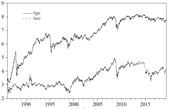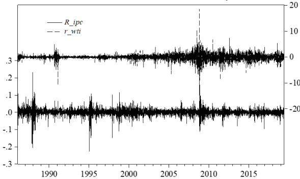 Los rendimientos accionarios se obtuvieron de la diferencia logarítmica del Índice de Precios y Cotizaciones (IPC) de la Bolsa Mexicana de Valores con frecuencia diaria, en el periodo que comprende del 3 de enero de 1986 al 4 de mayo de 2019, para un total de 8148 observaciones. La serie del IPC proviene de Economatica. Como proxy del precio internacional del petróleo se eligió al precio del West Texas Intermediate (WTI), que publica la Administración de Información Energética1 (EIA, por sus siglas en inglés). Ambas series están en dólares.