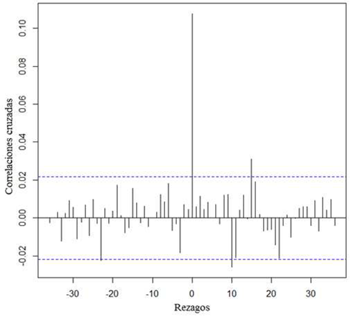 Por otro lado, la gráfica 3 muestra las correlaciones cruzadas entre los rendimientos del IPC y las variaciones del precio del WTI, en la cual se puede apreciar que la mayor correlación entre ambas series de rendimientos se presenta de manera contemporánea y que hay muy pocas correlaciones cruzadas significativas en el rango considerado. Esto sugiere que no hay suficiente retroalimentación en el corto plazo entre ambas variables que deba ser considerada en el modelo.