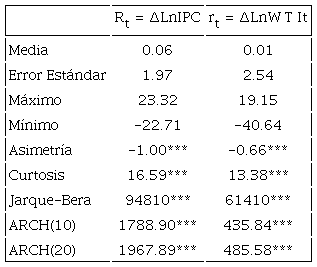 La gráfica 2 muestra el comportamiento de los rendimientos de ambos indicadores. En ésta se aprecia la presencia de valores extremos y de clusters (agrupamientos) de volatilidad, a lo largo de todo el periodo bajo estudio para los rendimientos accionarios. Estos son más recurrentes en el periodo previo a la crisis y muestran más estabilidad después de la misma. Dicho comportamiento se invierte para los rendimientos del WTI. Lo anterior refuerza la idea de modelar la volatilidad de los rendimientos accionarios a través de modelos GARCH.