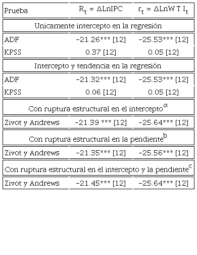 Por otra parte, las pruebas de Zivot y Andrews con diferentes tipos de rupturas, aplicadas a las series de rendimientos accionarios y del precio internacional del petróleo, sugieren que ambas series son estacionarias en presencia de al menos una ruptura estructural; de las cuales, las rupturas en intercepto y en tendencia e intercepto resultaron estadísticamente significativas.