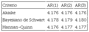 En el cuadro 3 se muestran los resultados arrojados por los criterios de selección del número de rezagos a considerar en la ecuación de la media. Como puede verse, prácticamente son indistintos o, si se prefiere, igualmente preferibles según el criterio de Akaike. Sin embargo, también se puede decir que el criterio bayesiano de Schwartz y el de Hannan y Quinn favorecen marginalmente a la especificación AR(1), razón por la que el modelado se llevó a cabo incluyendo un rezago de los rendimientos accionarios en la ecuación de la media.