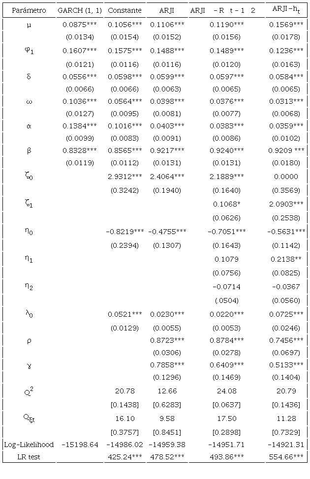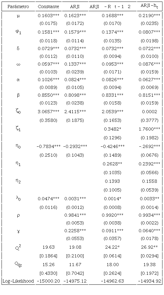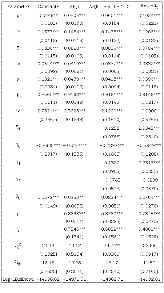 En el cuadro 4 se presentan las estimaciones de los modelos GARCH, en los que se incorporan los cambios en el precio internacional del petróleo en la ecuación de la media de los rendimientos accionarios. La primera columna muestra el modelo GARCH estimado sin saltos, en la segunda columna se presentan los resultados del modelo de saltos de intensidad constante , mientras que en la tercera columna se encuentran los resultados del modelo , en tanto que las columnas cuarta y quinta muestran los resultados de los modelos y , respectivamente.