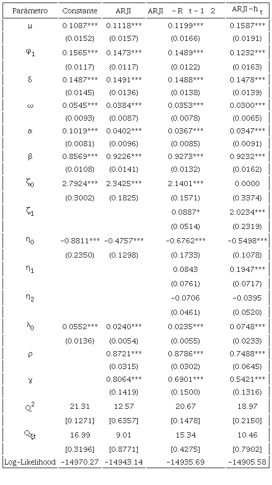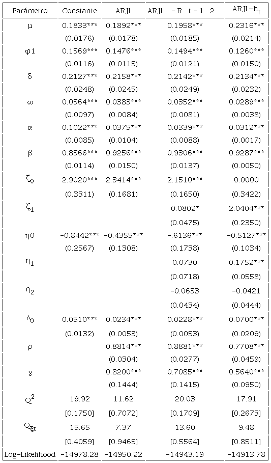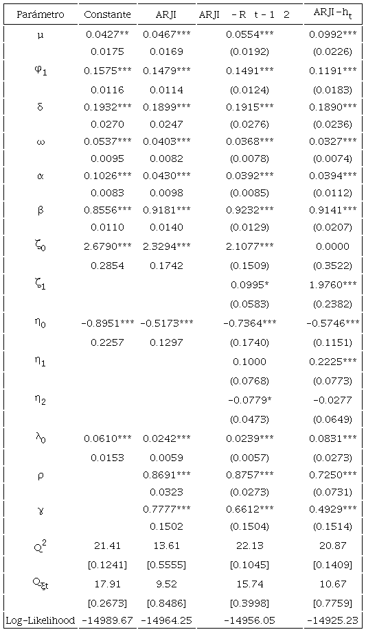 Las pruebas de incorrecta especificación para los distintos modelos estimados con presencia de saltos se llevaron a cabo con el estadístico Ljung-Box (LB) modificado y se reportan para dar cuenta de la posible presencia de autocorrelación en los residuos estandarizados al cuadrado y en los residuos de la intensidad de salto con 15 rezagos en la parte inferior del cuadro 4 y no se encontró evidencia de la presencia de autocorrelación en los residuos de los modelos estimados al nivel de significancia del 5%.