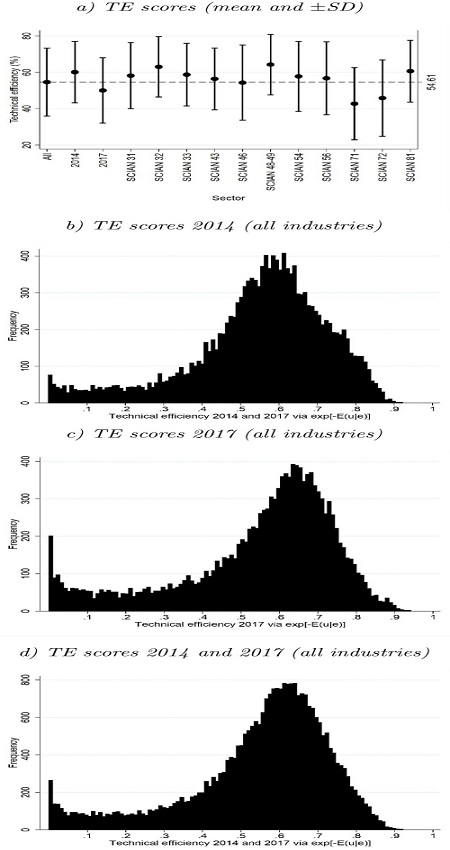 Using the set of parameter estimates in table 3, figure 1 displays ATE scores and ± one standard deviation in the corresponding samples. For the pooled sample, 2014 and 2017, and for the 11 NAICS industries, the ATEs are 54.6%, 56.4%, 54.3%, and 42.7%-64.2%, respectively. This finding indicates that SMEs in these industries can obtain on average 35.8%-57.3% additional output by using the same amount of inputs more efficiently. For the economic recovery, this finding has important implications since it may help SMEs to adapt to a new market configuration in the short-term by adjusting their existing production processes.