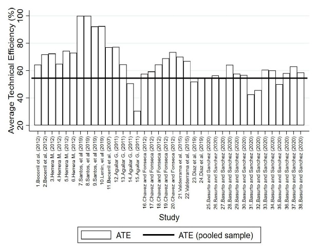 To contextualise our findings, we compare them with previous research in table 1. Figure 3 shows ATEs reported by studies where Mexico is the case of interest. The first 10 studies use the DEA and the rest the SFA models. Overall, we observe lower ATEs in SFA than in DEA studies, but our results coincide with those using the same approach. The comparisons among studies are not always possible because the corresponding samples and industries of interest are not the same. However, our results for ATEs are in line with those in Aguilar (2011), Chavez and Fonseca (2012), Valderrama et al. (2015) and Diaz et al. (2019), who analyse manufacturing and automotive industries.