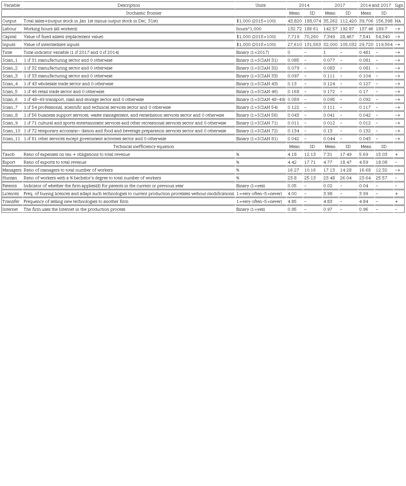 Table 2 displays definitions, measurement units, descriptive statistics, and expected signs in the production and TI equations for each control variable. On average, we observe that total annual output in both years reaches $39.7 million Mexican pesos (MXN).14 To produce such an output, SMEs utilize, on average, 137 460 working hours,15 $7.5 million MXN of fixed assets and $29.7 million MXN of intermediate inputs. As indicated in the last column, we expect a non-negative contribution of the three inputs to total output (Kumbhakar et al., 2015). Looking at the 11 NAICS indicators, we observe that 17.0%, 13.2%, 12.7%, 11.7%, and 10.4% of SMEs (65% in total) belong to the retail trade, temporary accommodation and food and beverage preparation services, wholesale trade, professional, scientific and technical services, and the 33 manufacturing industries, respectively. For the relationship between output and such indicators, we expect either a negative or a positive association, which depends on the base category (excluded indicator).16