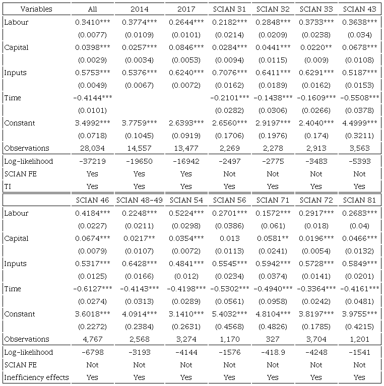 Table 3 shows the parameter estimates of the frontier for the pooled sample of 2014 and 2017, and for the 11 NAICS industries using the CD function with inefficiency effects. We present the set of parameter estimates for the 11 NAICS to see whether there is heterogeneity among industries (or not) in terms of elasticities, returns to scale or technological change. We transform all variables into their logarithm forms, except binary and categorical variables. Results in table 3 indicate that a marginal increase of 1% in labour, capital, and intermediate inputs lead to output increments of 0.16%-0.52%, 0.02%-0.08%, and 0.48%-0.71%, respectively. In most cases, we observe decreasing returns to scale (from 0.81 to 0.97), except in the 33, 46 and 54 NAICS industries where we find constant returns to scale. Interestingly, we find that technical change is negative and statistically significant in all industries.