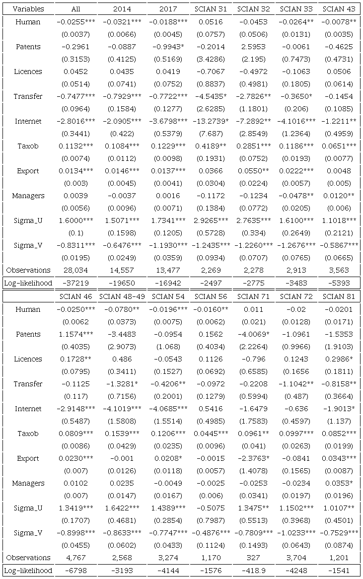 The reader should be aware of some caveats of this research. First, data availability prevents us from carrying out the analysis for large and micro-sized firms in Mexico and from including all inefficiency effects suggested by the existing literature. Second, although ENAPROCE reports data from 2014 and 2017 and some firms appear in both surveys, the time frame is still not enough to identify structural changes over time. Further steps of this research should: i) include tax payments in the TI equation to test whether such payments enlarge TI or not; and ii) carry out the analysis using data on large firms to test whether the knowledge- TE association is stronger than in SMEs or not, because large firms more likely invest in the creation of knowledge.