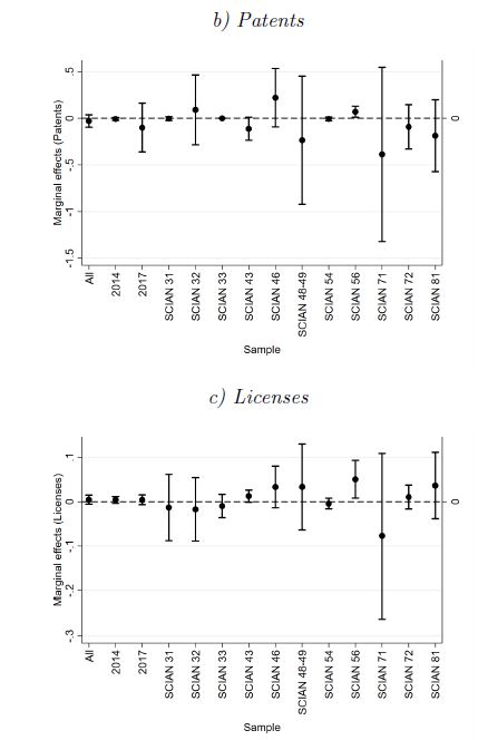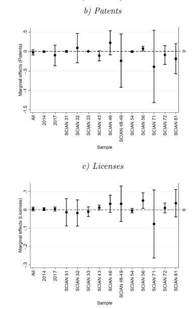 Using parameter estimates in table 4 and equation (6), we compute firm-specific marginal effects of each control variable on TI. Figure 2 shows the average and ± 1.96 SD marginal effects for the 8 explanatory variables and for different samples. In line with parameter estimates in table 4, higher proportions of employees with a bachelor’s degree tend to reduce TI. On average, a 10% increase in such a proportion leads to a 3% reduction in TI. The only exceptions are the 31 and 71 NAICS industries, where most of the firm-specific marginal effects are close to zero (see figure 2a). Although SMEs that asked for a patent are on average 2.9% more efficient than other SMEs, most of the firm-specific marginal effects in different industries are close to zero. There are some exceptions. SMEs in the 43, 71, 72, and 81 NAICS industries that applied for a patent are on average 11.3%, 38.7%, 9.1%, and 18.7% more efficient than other SMEs in the corresponding industries (see figure 2b).
