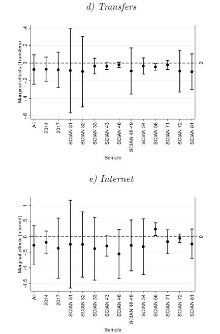 We also observe heterogeneity of firm-specific marginal effects of licenses and transfers among industries. Regarding licences that allow SMEs to use existing technologies in their production processes, most of the marginal effects are close to zero. However, SMEs in the 46, 48-49, 56, and 81 NAICS industries that rarely buy these licences tend to be more inefficient than their counterparts. On average, reducing the frequency of technology acquisition by one unit increases TI scores by approximately 0.45% in the pooled sample (see figure 2c). In terms of transfers, we observe that SMEs selling their own technology to other firms less frequently are, on average, more efficient than those SMEs doing it regularly. Our results indicate that reducing the frequency of technology transfers by one unit shrinks TI scores by approximately 7.4% in the pooled sample (see figure 2d). Furthermore, if the firm uses the Internet in its production processes, it is, on average, 27.6% more efficient than those without access to the Internet (see figure 2e).