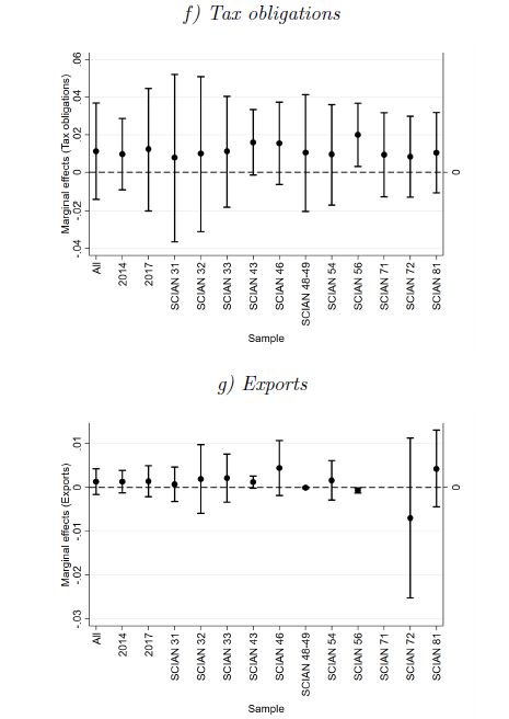 In line with our initial expectations, SMEs spending larger amounts of money on tax payments procedures are less efficient than their counterparts. Under such circumstances, policymakers should simplify tax payments procedures to reduce harmful effects on TE of SMEs, especially in the economic recovery. Notice that we do not analyse tax payments as inefficiency effects in the TI equation. As in other studies, such as Diaz et al. (2019) and Alvarez and Crespi (2003), we do not find solid evidence that firms exposed to the external market are more efficient than those participating in the domestic market.