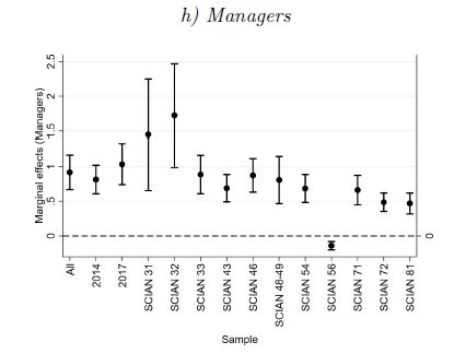 Bigsten et al. (2000) and Tovar (2012) find that firms selling their output in the external market are, on average, more efficient than other firms; notwithstanding, Alvarez and Crespi (2003) encounter a null association, and Diaz et al. (2019) the opposite relationship. Our findings align with Diaz et al. (2019) and Alvarez and Crespi (2003). However, given our data’s cross-sectional nature, we think that omitted variables might cause a bias in the parameter estimates and can be explored carefully in future studies. For the share of managers over total employees, the results are in line with Taymaz (2005), who do not find a statistically significant association between administrative personnel and TI. We argue that such a relationship should be analysed at the firm level and see whether the current level of managers per worker is optimal or not.