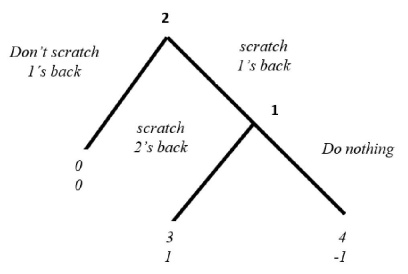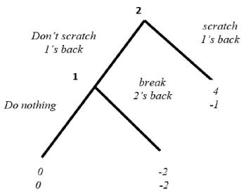 As the emotion of reciprocity can also make threats credible, I argue that the threat made by Player 1 to break Player 2’s back in figure 24 should be evaluated as unkind. If Player 2 doesn’t scratch Player 1’s back, then he is unkind to Player 1, who may want to carry out her threat in return. While a SRE only evaluates the threat of Player 1 if it is on the equilibrium path, namely if it is carried out, as both Klein and O’Flaherty (1993) and Schelling (1960) note, a threat is successful if it is not carried out. Because a threat that is not carried out is off the equilibrium path, a SRE does not assess the kindness of threats that are successful. I argue that the threat made by Player 1 should be evaluated as unkind, even if it is not carried out.
