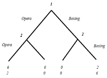 Muller and Sadanand (2003) conducted an experiment with the sequential Battle of the Sexes shown in figure 4,8 using the direct method, where Player 2 chooses the action he will take after observing the action taken by Player 1.9 Muller and Sadanand found that 115 of the 120 participants acting as Player 1 chose to play Opera, while, of the 115 participants acting as Player 2 that observed Opera, 103 chose to play Opera and 12 chose to play Box. Only five of those acting as Player 1 chose to play Box, in all of which cases, their opposing players chose to play Box, as predicted in Observation 1.