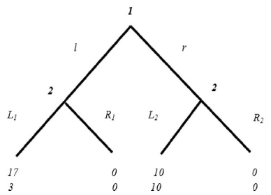Güth et al. (2001) conducted an experiment with three variations of the Mini-ultimatum game shown in figure 5, using both the direct and strategy methods, in which they did not observe the SRE (r,(L1,R2)) being played. Twenty-six participants used the strategy method to play the game shown in figure 5, while none of the 13 participants that played as recipients used the strategy (L1,R2), nor did any of the 62 participants who played as recipients using all variations in the strategy method.