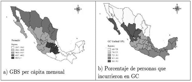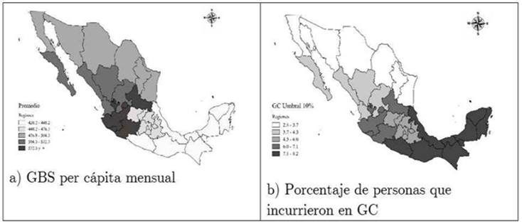 De acuerdo con la OMS y el Banco Mundial (2017), a los elevados gastos en salud se les denomina gastos catastróficos (GC), puesto que superan algún umbral de la capacidad de pago del hogar. En el presente documento se definen como GC aquellos que impliquen la erogación mayor o igual al 10% del ingreso corriente total, lo cual se realiza también a nivel mensual per cápita, de manera que permite el análisis de la evolución temporal de los elevados gastos por concepto de salud. En este sentido, el acceso a los servicios de salud cobra particular relevancia para el caso mexicano, pues se ha verificado que los individuos que no cuentan con algún esquema de atención médica pública suelen reportar mayores niveles de GBS e, incluso, suelen incurrir en GC (Díaz-González y Ramírez-García, 2017; Guzmán, 2018).