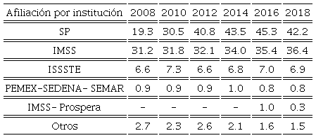 La evidencia empírica señala que una proporción importante de las variaciones en los montos del gasto de bolsillo en salud en México se explica por la afiliación a las diversas instituciones del sistema de salud (Bautista-Arredondo et al., 2014; Méndez, 2017; Knaul et al., 2018). El modelo sanitario del sistema mexicano es mixto, por lo que intervienen actores públicos y privados, y aun dentro del sistema público es posible encontrar diferencias por instituciones (Gómez-Dantés et al., 2011). Como explican Martínez y Murayama (2016), el sector público se conforma por dos subsectores. Primero, el Sistema de Seguridad Social atiende a los trabajadores del sector formal y jubilados, esto a través del Instituto Mexicano del Seguro Social (IMSS), el Instituto de Seguridad y Servicios Sociales de los Trabajadores del Estado (ISSSTE, tanto federal como estatal), y los servicios que se ofrecen a los trabajadores de Petróleos Mexicanos (PEMEX), Secretaría de la Defensa Nacional (SEDENA) y Secretaría de Marina (SEMAR). Segundo, el Sistema de Protección Social en Salud (SPSS), el cual es coordinado por la Secretaría de Salud (SSA), y funciona para aquellos que no son derechohabientes de la seguridad social, por medio de los Servicios Estatales de Salud (SESA), el IMSS-Oportunidades (luego IMSS-Prospera, IMSS-P) y -hasta 2020- el Seguro Popular (SP, más tarde sustituido por el Instituto de Salud para el Bienestar).