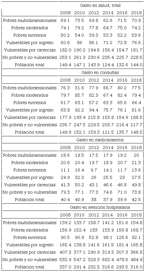 Se encontró que el gasto en salud varía sustancialmente entre los pobres extremos multidimensionales y los no pobres y no vulnerables. Además, que los gastos en medicamentos representan la menor proporción de gasto, en todos los años y grupos de población; manteniéndose la hospitalización como el rubro que implica las mayores erogaciones por parte de los individuos. Esto se convierte en un reto para la política pública, en un país donde el nivel de gasto en salud es un determinante que ha llevado a dejar de lado la prevención de enfermedades y el cuidado de la salud por una atención predominante curativa (Martínez y Murayama, 2016; OCDE, 2016).